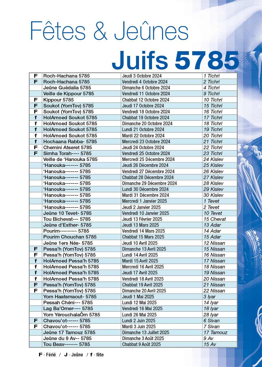 F : Férié / J : Jeûnes / f : Fêtes