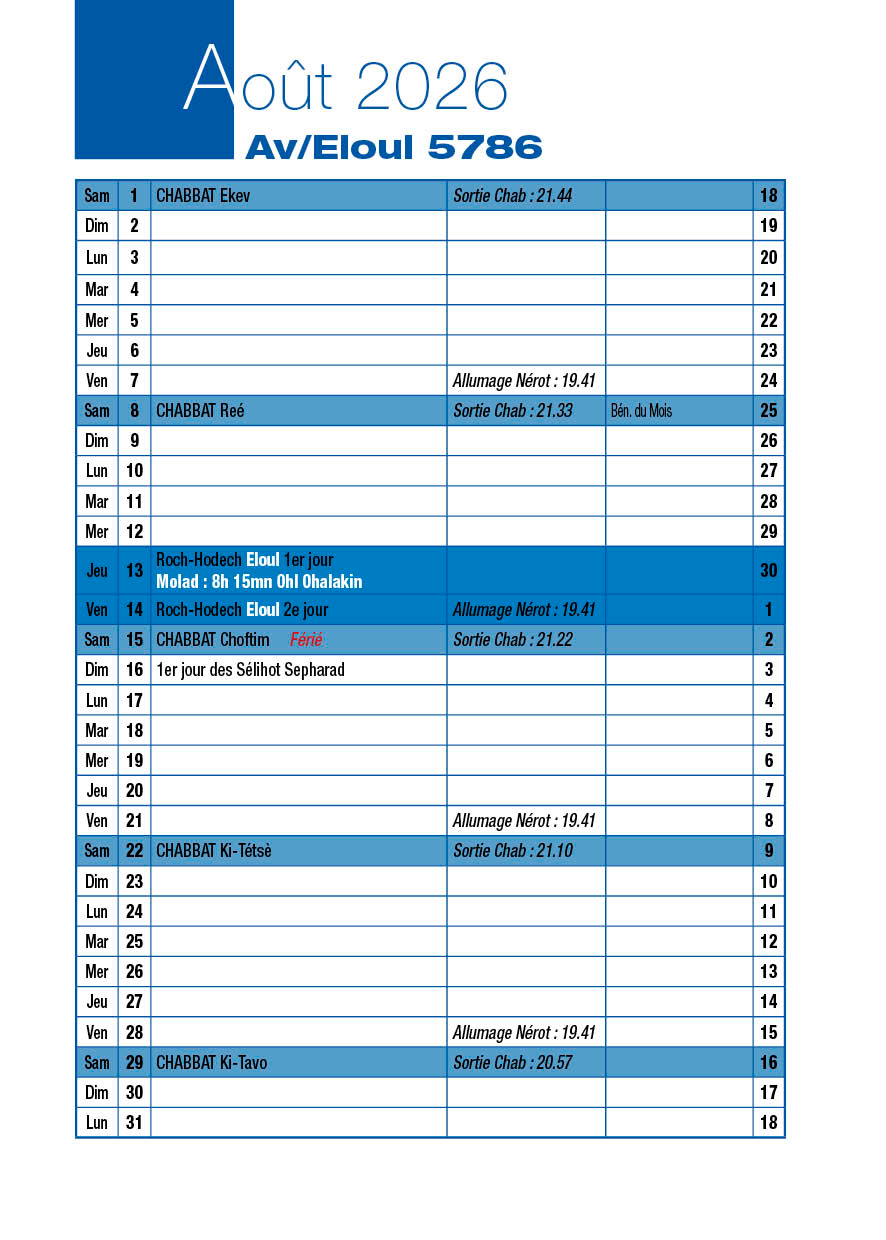 Avant-veille de Roch-Hodech Eloul Mercredi 12 Août 2026