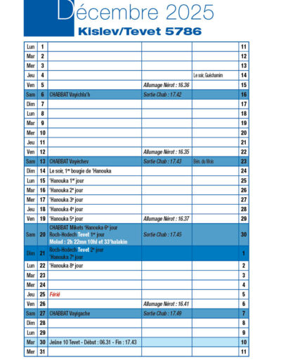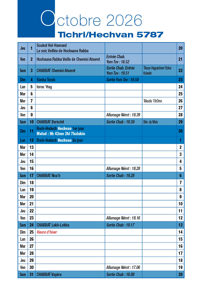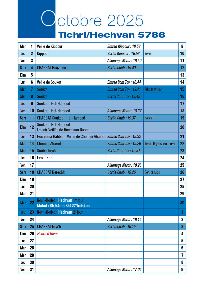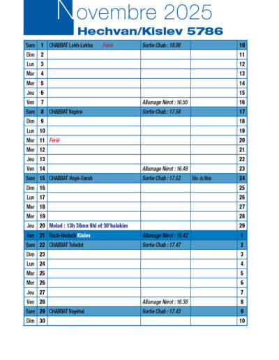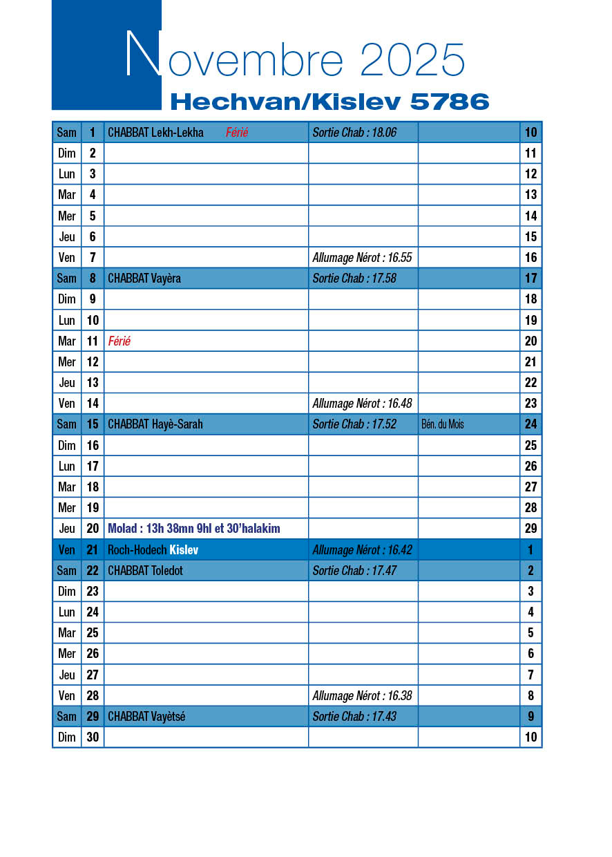 Avant-veille de Roch-Hodech Kislev Jeudi 20 Novembre 2025