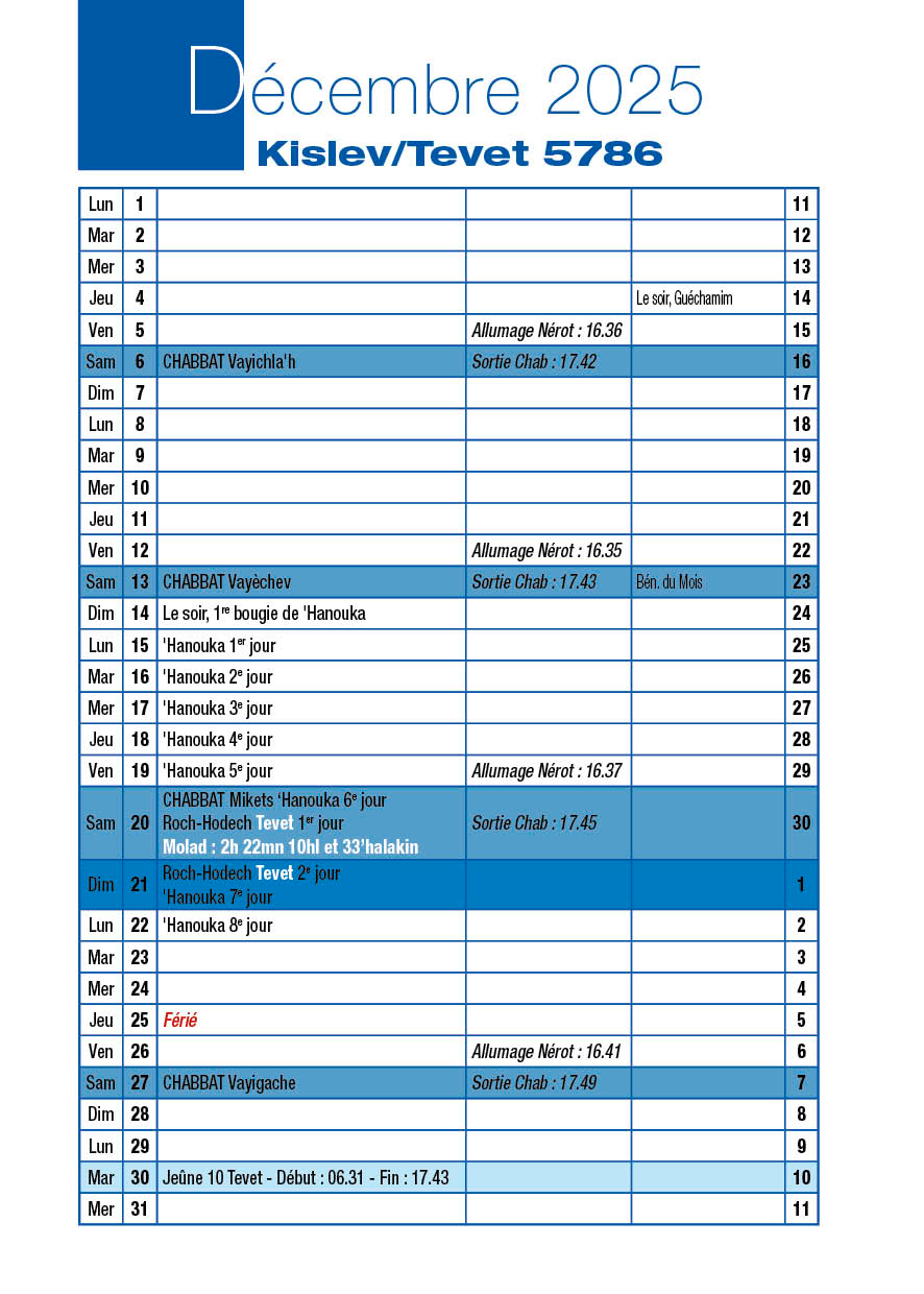 Jeûne du 10 Tévet Mardi 30 Décembre 2025