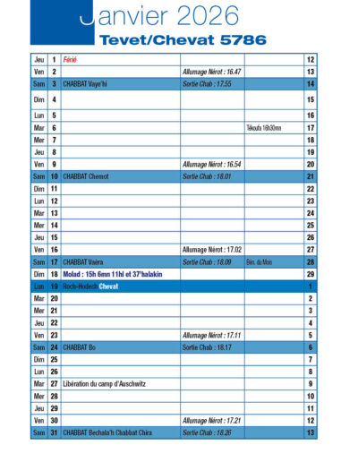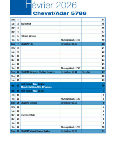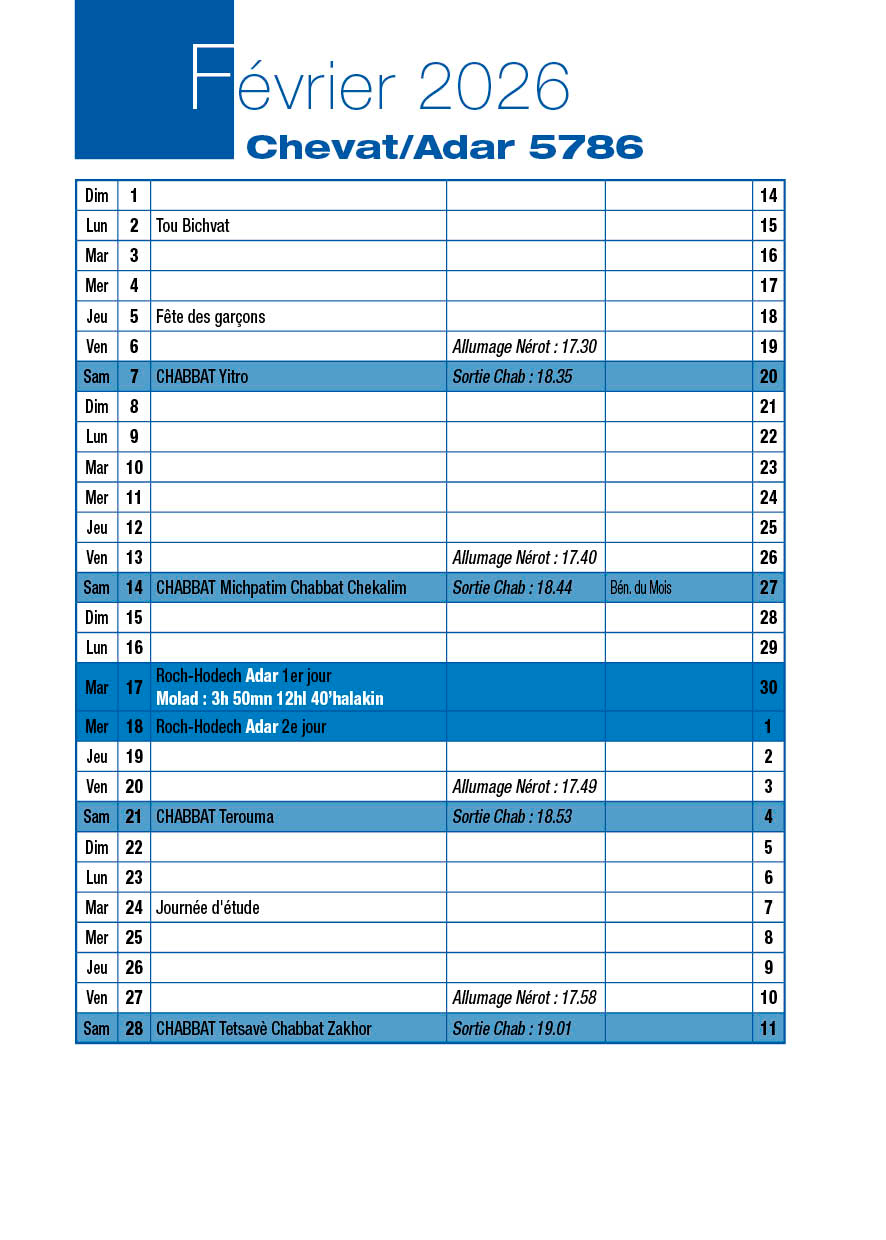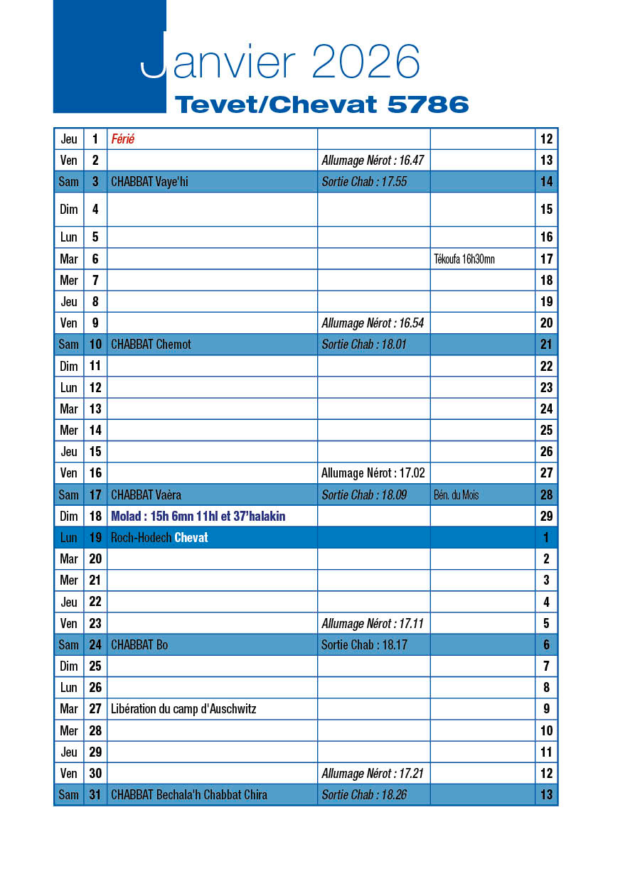 Veille de Roch-Hodech Chevat Dimanche 18 Janvier 2026
