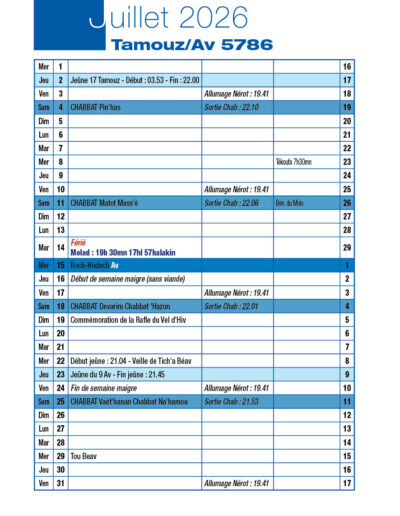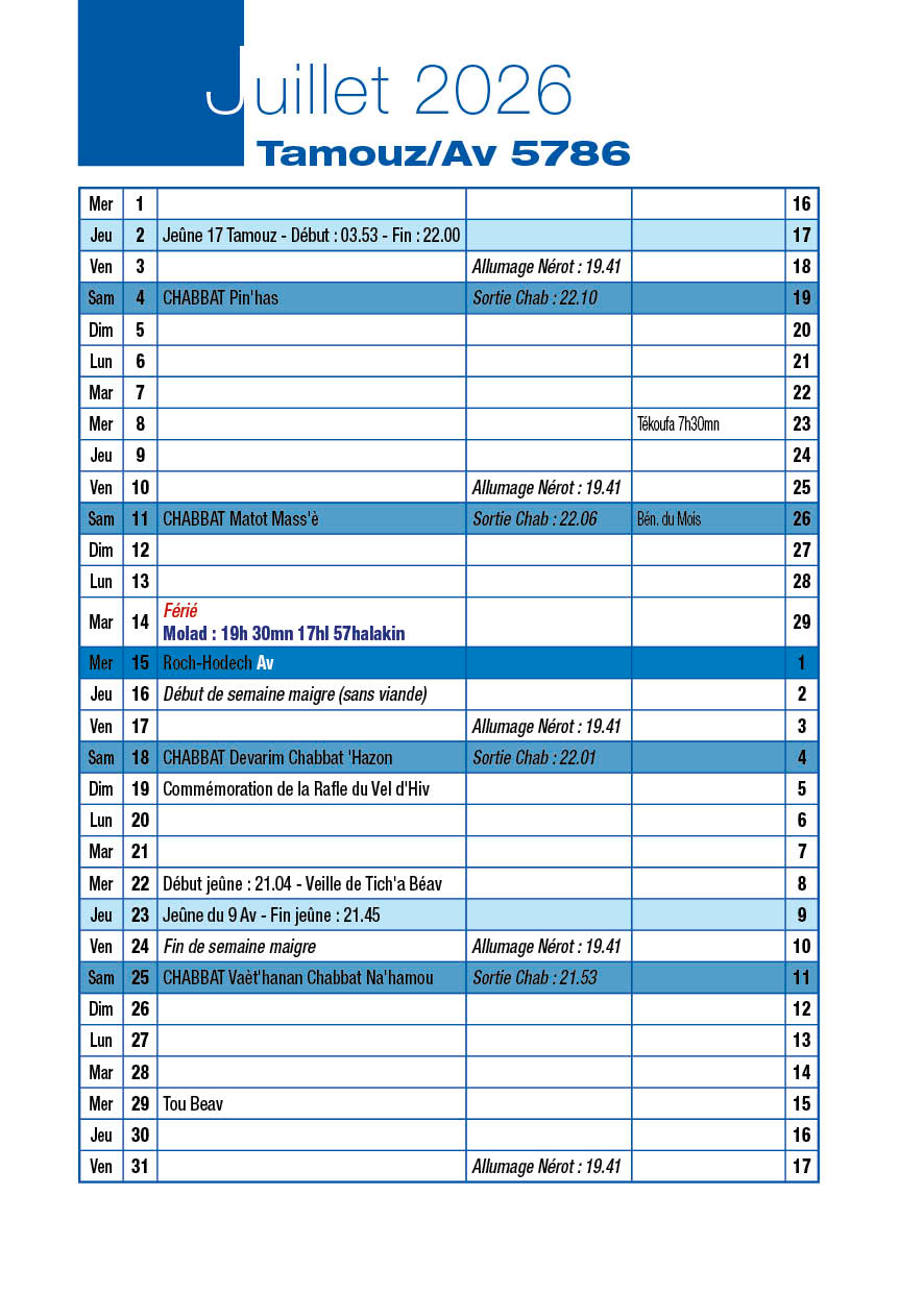 Veille de Roch-Hodech Av Mardi 14 Juillet 2026