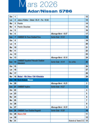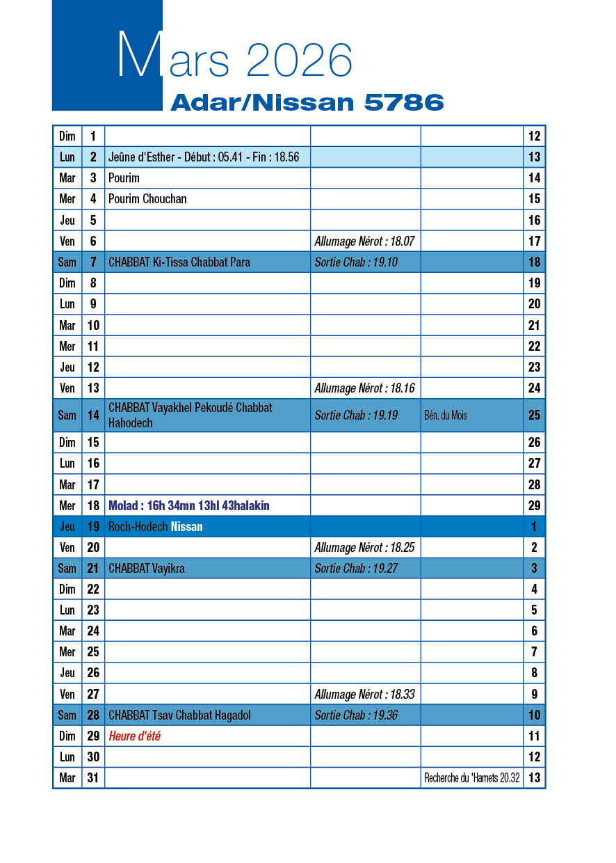 Avant-veille de Roch-Hodech Nissan Mercredi 18 Mars 2026