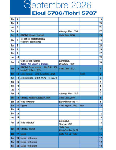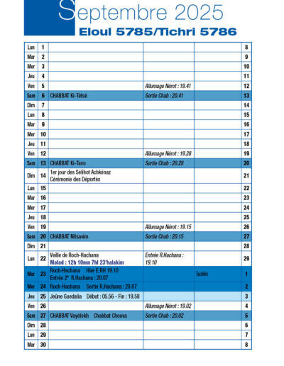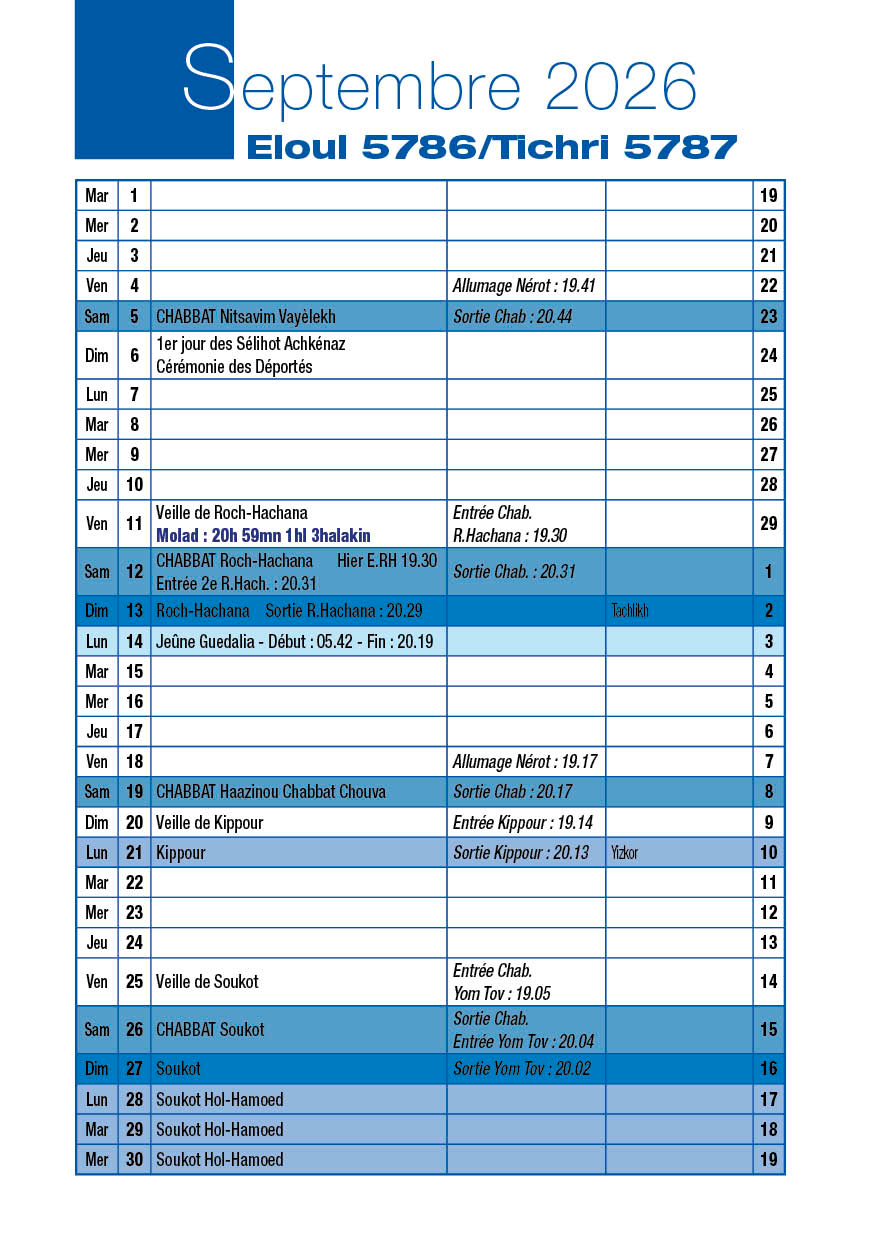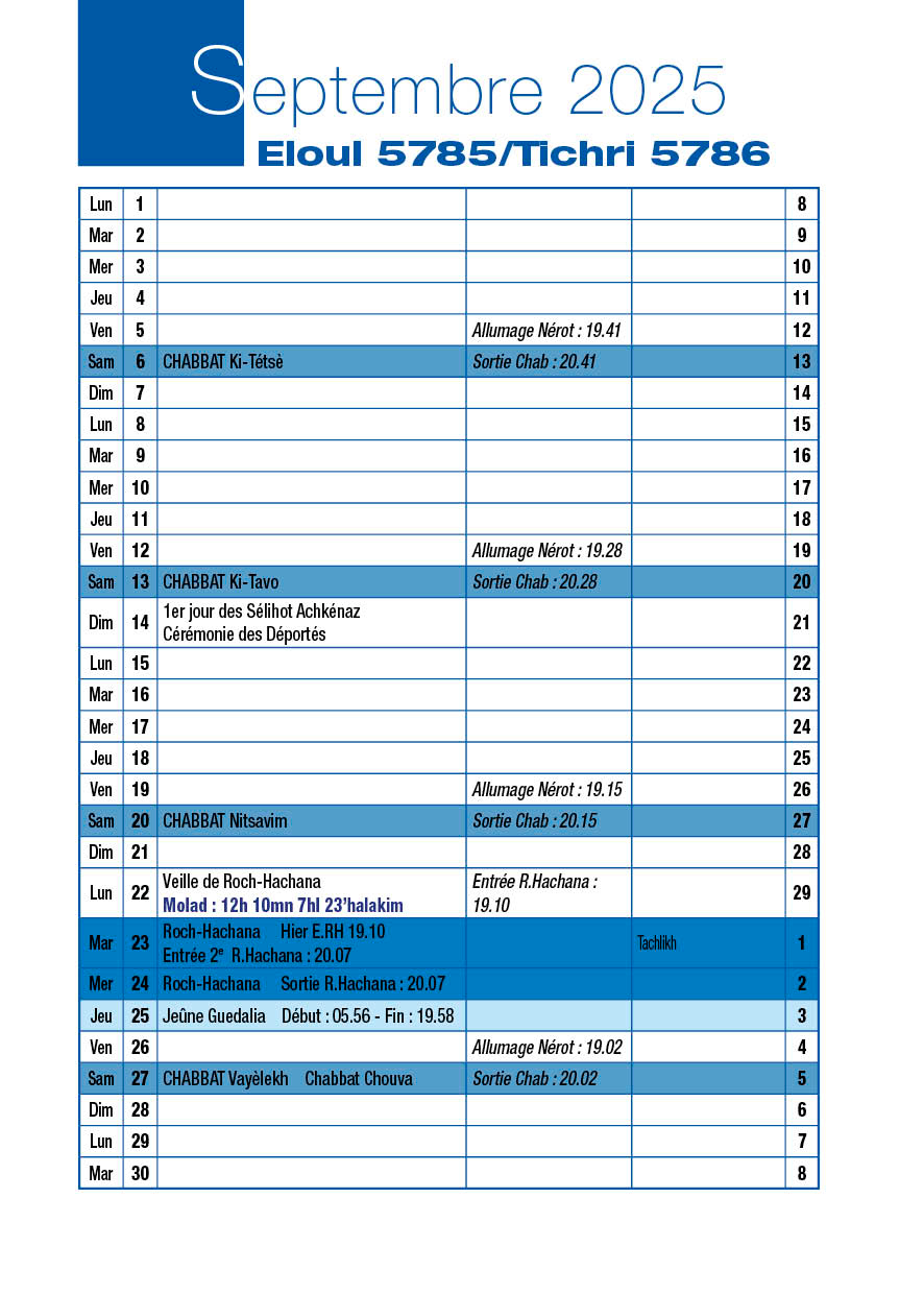 Roch-Hachana Mardi 23 et Mercredi 24 Septembre 2025